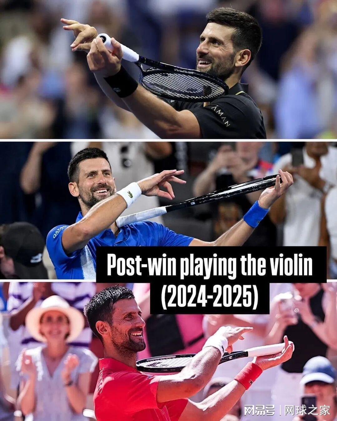 从澳网的撕衣服,到温网的吃草,再到美网的挂电话,一直延续到2025年的劈叉和2026年澳网的拉小提琴,德约科维奇在20多年的职业生涯中展示了不同风格的庆祝动作。